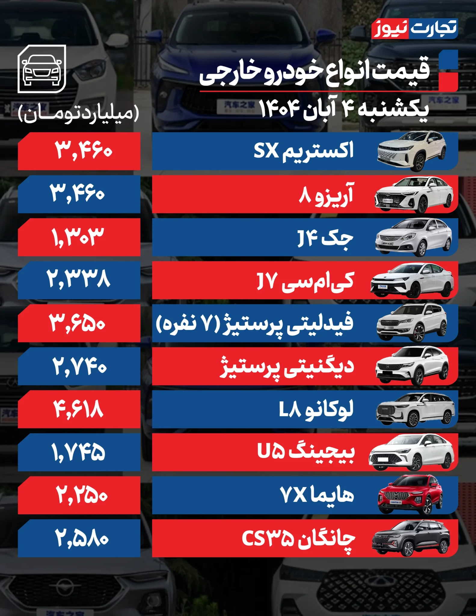 قیمت خودرو امروز 4 آبان 1404 + جزئیات